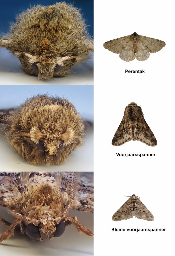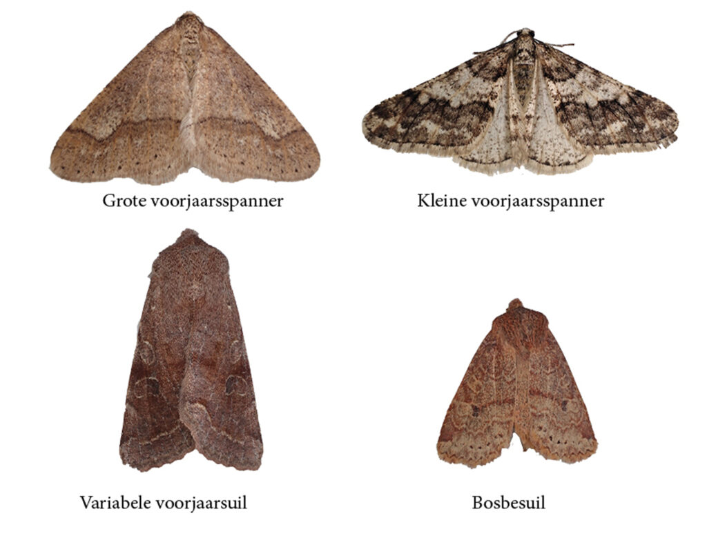 In de LED-emmers vier soorten nachtvlinders. Van elke soort slechts één exemplaar. Grote voorjaarsspanner, Kleine voorjaarspanner, Bosbesuil en Variabele voorjaarsuil.